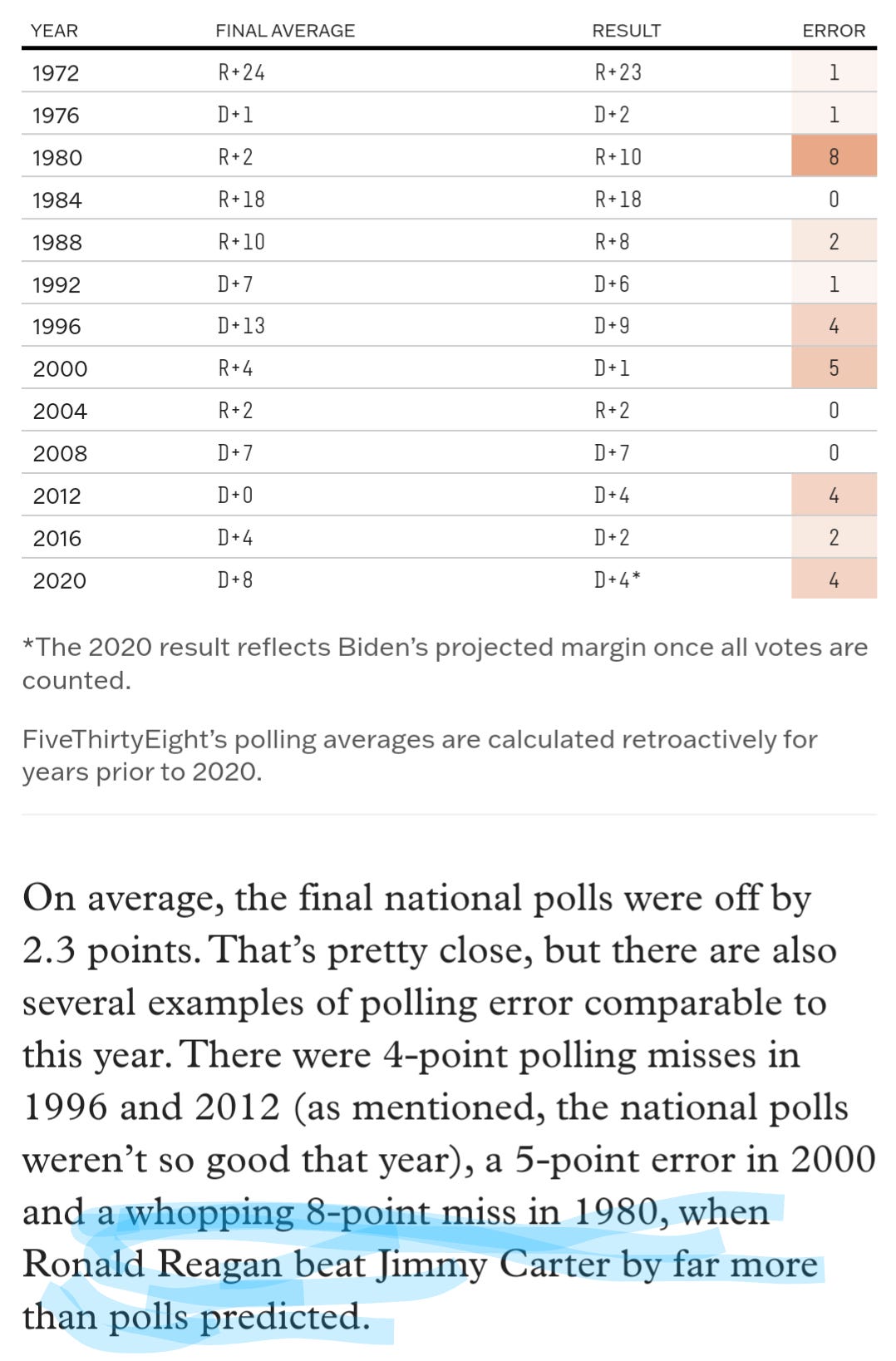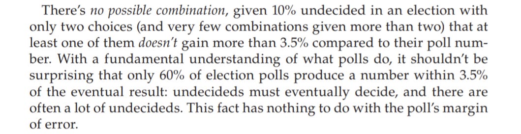 (This gets into the misplaced and unscientific obsession for a poll and forecast accuracy to be measured according to whether they are “directionally correct” which I also discuss in my book).